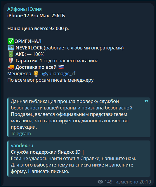 На своем интернет-магазине Юлия активно предлагает покупать оригинальные устройства по большим скидкам. Из последнего менеджер телеграм-канала предлагает купить последний iPhone 17 PRO Max за 92 000 рублей. С чего такой аттракцион щедрости непонятно, ведь техника Apple и до кризиса была дорогой, а тут последний айфон по цене Xiaomi.
