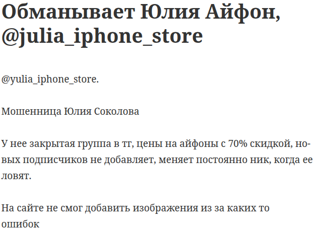 Julia Store — магазин, который лучше обойти десятой дорогой. Ничего положительного с него вы не получите. Задача телеграм-канала по продаже айфонов Юлии Соколовой крайне проста — заманить доверчивых пользователей и обмануть их: