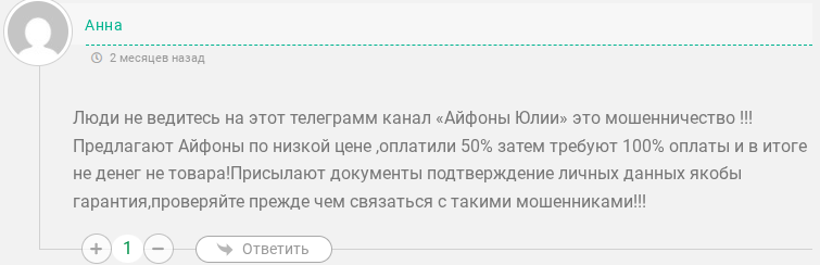 Соколова Юлия Евгеньевна на самом деле не продает айфоны. Она лишь заставляет верить в то, что есть такие большие скидки. На самом деле весь проект построен так, чтобы выманить ваши деньги. Если не хотите попадать на уловки таких скамеров, тогда читайте нас. Мы в статьях каждый день разоблачаем мошенников, чтобы вы всегда были в безопасности.