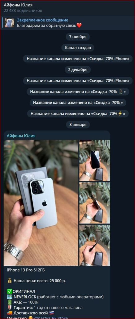Лицензии на продажу электроники у проекта нет, как и финансовой отчетности. Магазин работает нелегально, поэтому про соблюдение закона РФ можно даже не вспоминать. Работая с такими проектами, вы заведомо ставить себя под риск скама. Более того, о проекте с айфонами Соколовой Юлии нет никакой информации на профильных форумах. Учитывая этот нюанс, можно сразу сказать, что автор маркетплейса работает исключительно в рамках телеграма, где постоянно делает ребрендинг, чтобы поисковый робот не удалил канал.