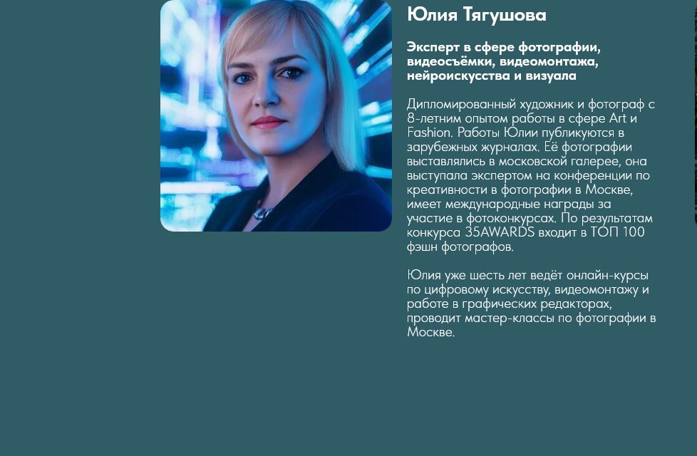 - Юлия Тягушова не разместила документов о своем образовании и квалификации. Поэтому, ее навыки и умения в области фотографии и работе с нейросетями вызывают сомнения.