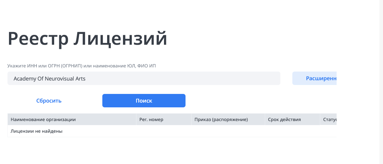 На сайте Academy Of Neurovisual Arts указано, что школа имеет лицензию Минобрнауки, однако документ здесь не размещен. Проверка показала, что разрешение ведомства отсутствует.