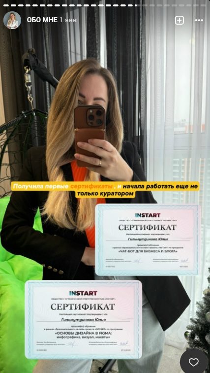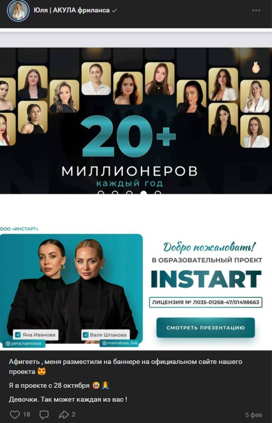 Но курсы Юлия предлагает не авторские, а от школы InStart. Об этом автор говорит как в постах: