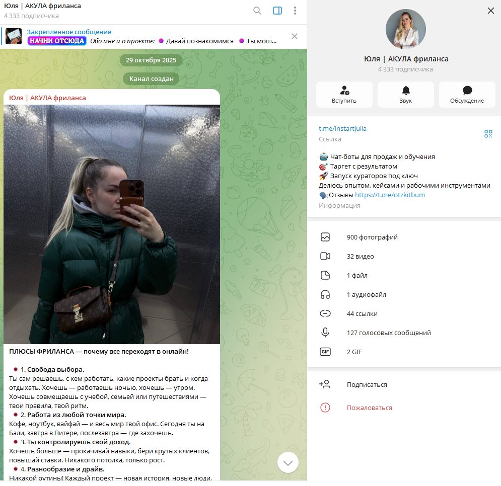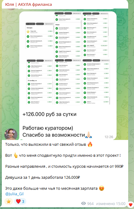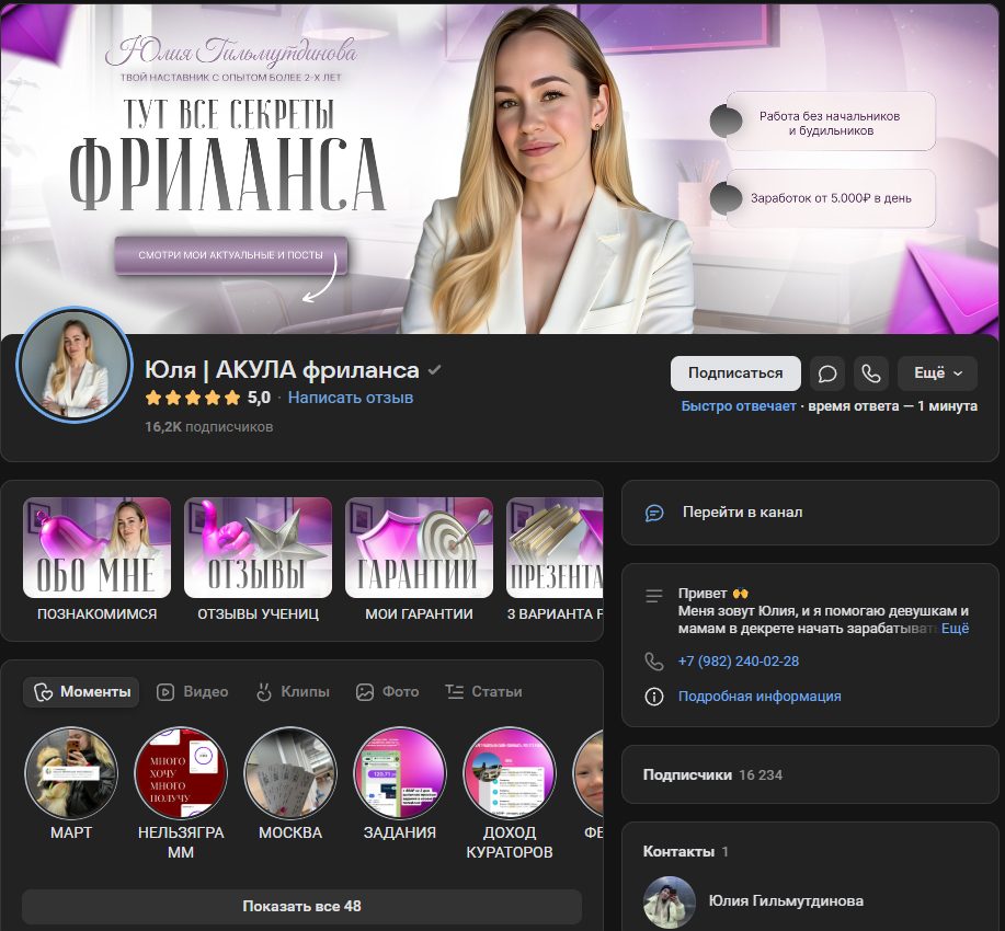 Юля АКУЛА фриланса – проект, запущенный фрилансером и наставником Юлией Гильмутдиновой. Девушка заявляет, что в этой сфере уже более двух лет. Пользователям девушка предлагает наставничество по разным программам: менеджер маркетплейсов, дизайнер, SMM и тд. Проект Юля АКУЛА фриланса отзывы получить не успел, мы провели проверку деятельности девушки.