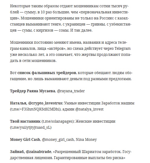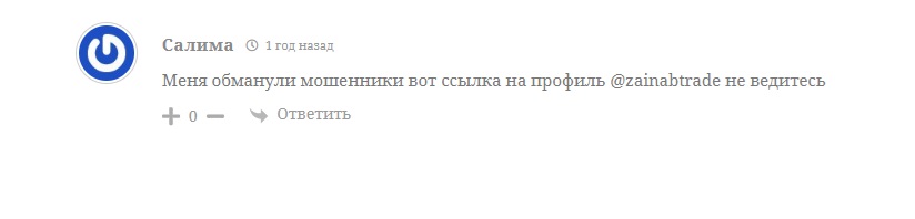 Пользователи сообщают о классических признаках обмана. Например, один отзыв предупреждает: «Меня обманули мошенники вот ссылка на профиль @zainabtrade не ведитесь». Это прямое указание на невыплаты и исчезновение контакта после перевода средств.
