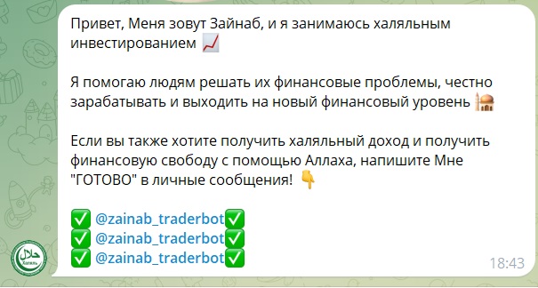 Zainabtrade отзывы : разоблачение скам — трейдера в Телеграмме Разрешенный Шариатом Заработок Государственная Лицензия Гарантированные Выплаты Без Риска