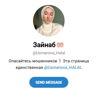 Основная активность Зайнаб Усмановой сосредоточена в мессенджере Telegram. У нее есть публичный канал «ZAINAB | Халал инвестиции», который насчитывает около 12,3 тысяч подписчиков.