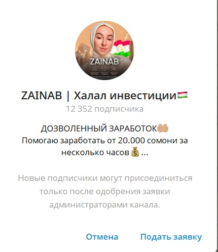 Контент в канале состоит из объявлений о возможности заработка. В постах автор обещает помочь получить от 20 000 сомони за несколько часов. Новые участники могут присоединиться только после одобрения заявки, что создает видимость эксклюзивности.