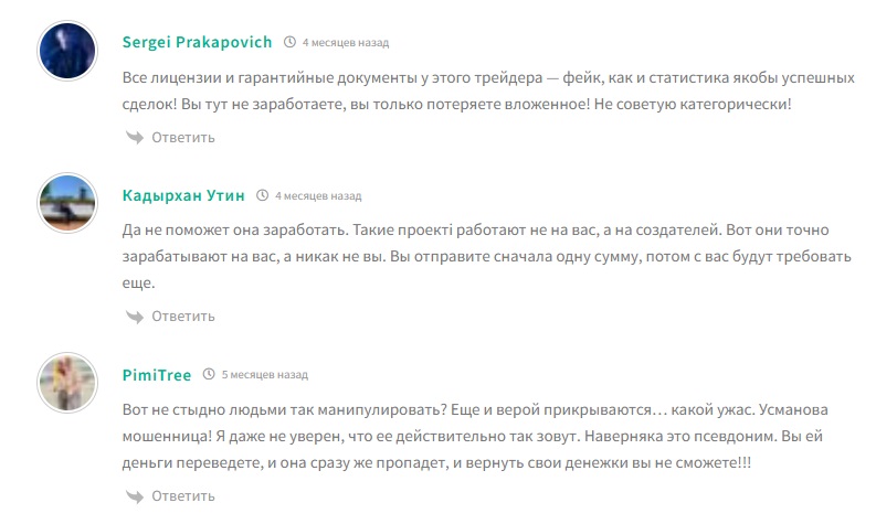 Сервис «Вкладер», специализирующийся на проверке финансовых проектов, прямо относит деятельность Зайнаб Усмановой к мошеннической. Проект включен в списки фальшивых трейдеров, которые выманивают деньги. В этих предупреждениях Zainabtrade фигурирует наряду с другими известными псевдотрейдерами.