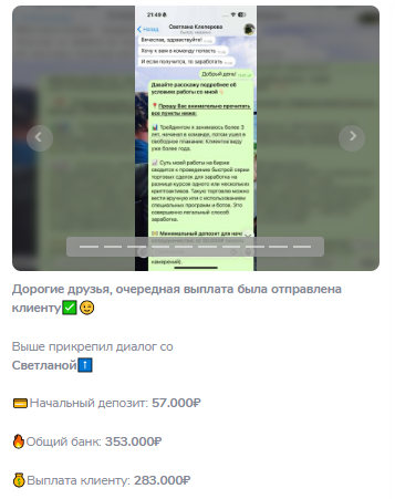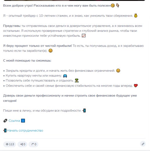 Пользователям предлагают классическую схему работы. Автор проекта пишет, что ему можно перевести деньги и он поможет заработать. 20% от заработка он оставляет себе.