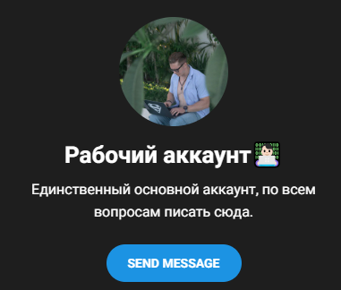 В публичном поле остался только личный аккаунт. Никакой конкретной информации по нему нет. Описание максимально нейтральное. Ничего экстраординарного, просто предложение о сотрудничестве и способ связи.