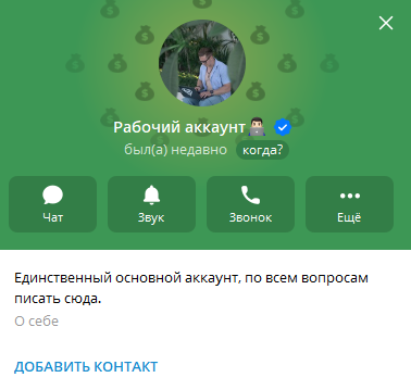 Администратором телеграм-канала «Законы Инвестирования» является пользователь «Рабочий аккаунт», в описании которого нет никакой информации. Инвестор не называет своего имени, хоть и не скрывает лица, поэтому определить его личность сложно.