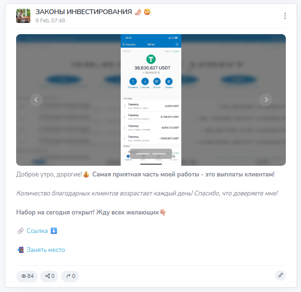 Создатель телеграмм-канала «Законы Инвестирования» занимается обычной раскруткой счета, предлагая пользователям перевести ему деньги и дожидаться прибыли через 3 дня.