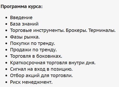 По данным из этих сайтов, на курсе рассматривались фазы рынка, покупки и продажи по тренду, а также отбор конкретных инструментов для трейдинга, учет рисков и торговые инструменты.