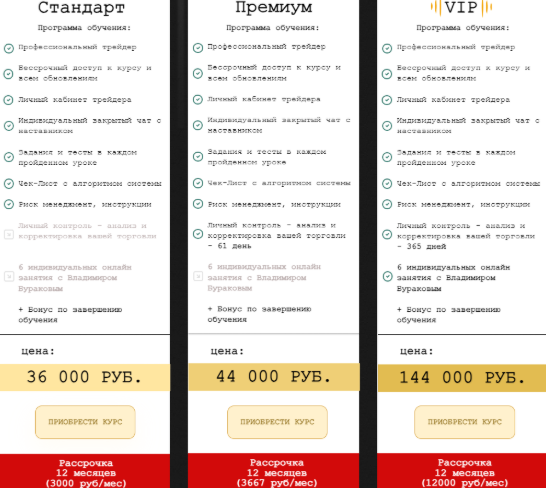 Стоимость тарифа «Стандарт» закрытого курса Владимира Буранова «Профессиональный трейдер» – ₽36,000, «Премиум» обойдется в ₽44,000, а VIP – ₽144,000.