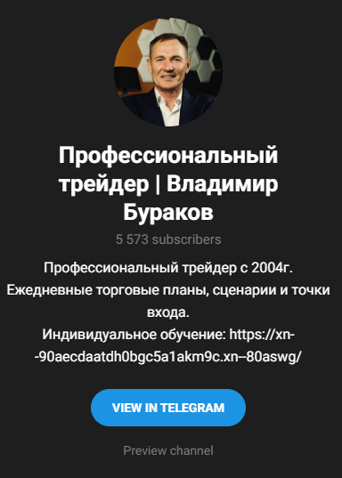 На декабрь 2025 года у Владимира Буранова есть личный телеграмм-канал на 5 573 пользователя. Им обещают ежедневные торговые планы, а также интересные сценарии и точки для входа на рынок.