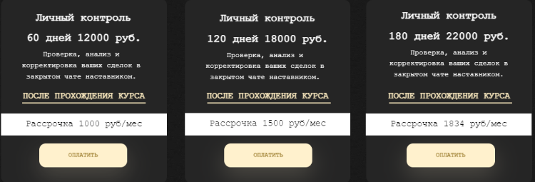 У Владимира также была услуга личного контроля с ценником в ₽12,000 за 60 дней. За эти деньги трейдер проверял и анализировал сделки партнера, давал экспертные комментарии. За полугодовое сопровождение клиент должен был заплатить ₽22,000.