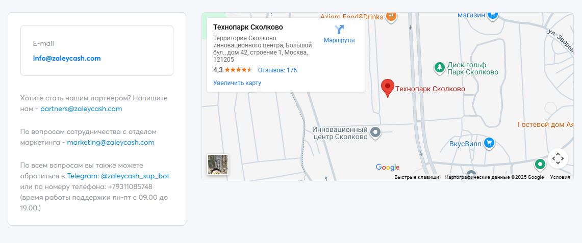 Вкладка «Контакты» кажется подозрительной. В качестве точки на карте здесь почему-то указан Технопарк Сколково. Какое отношение данное здание имеет к платежной системе – непонятно. Google-карты, например, не подтверждают, что здесь есть офис обозреваемой компании.