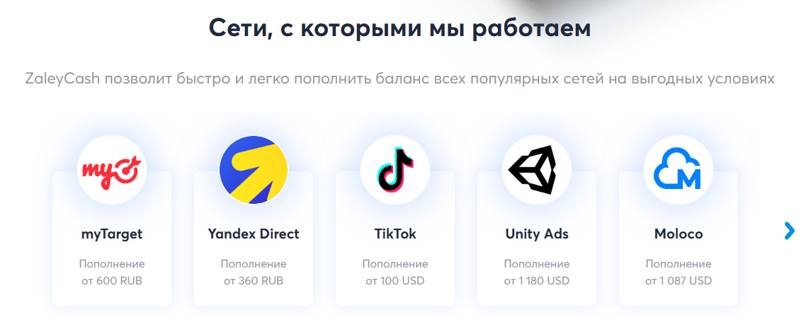Среди социальных сетей, доступных для пополнения в ZaleyCash Rub, представлены иностранные TikTok, Google Ads, Twitter и многие другие. Отечественные площадки вроде VK Рекламы и Yandex Direct тут тоже есть, что удобно. Минимальные суммы отличаются почти для каждого проекта — на это важно обращать внимание перед транзакцией.