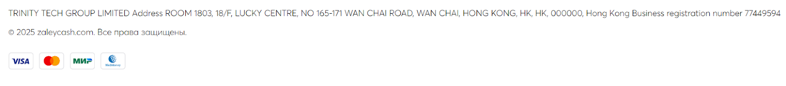 Более того, уже на другой странице указано, что «ЗалейКэш» относится к холдингу Trinity Tech Group Limited. Он базируется в Гонконге, а не в Москве. Отсюда же вытекают вопросы насчет защищенности российских клиентов, ведь проект не зарегистрирован в стране и не соблюдает законодательство о хранении личных данных.