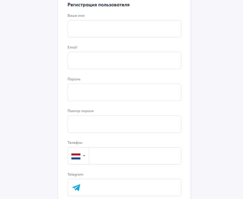 Перед пополнением баланса необходимо будет создать аккаунт. К регистрации можно перейти из верхней панели на сайте, в форме вводим имя, электронную почту, номер телефона и телеграм-аккаунт. Мы рекомендуем с осторожностью делиться подобной информацией.