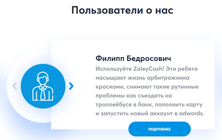 Отзывам о сервисе «Залей Кэш» на официальном сайте не стоит верить на слово. Их авторами указаны непонятные пользователи – один из них, допустим, подписан как Филипп Бедросович. Верифицировать достоверность комментария невозможно, ведь его на площадку добавили сами разработчики и ссылки на соцсети автора они не дают.
