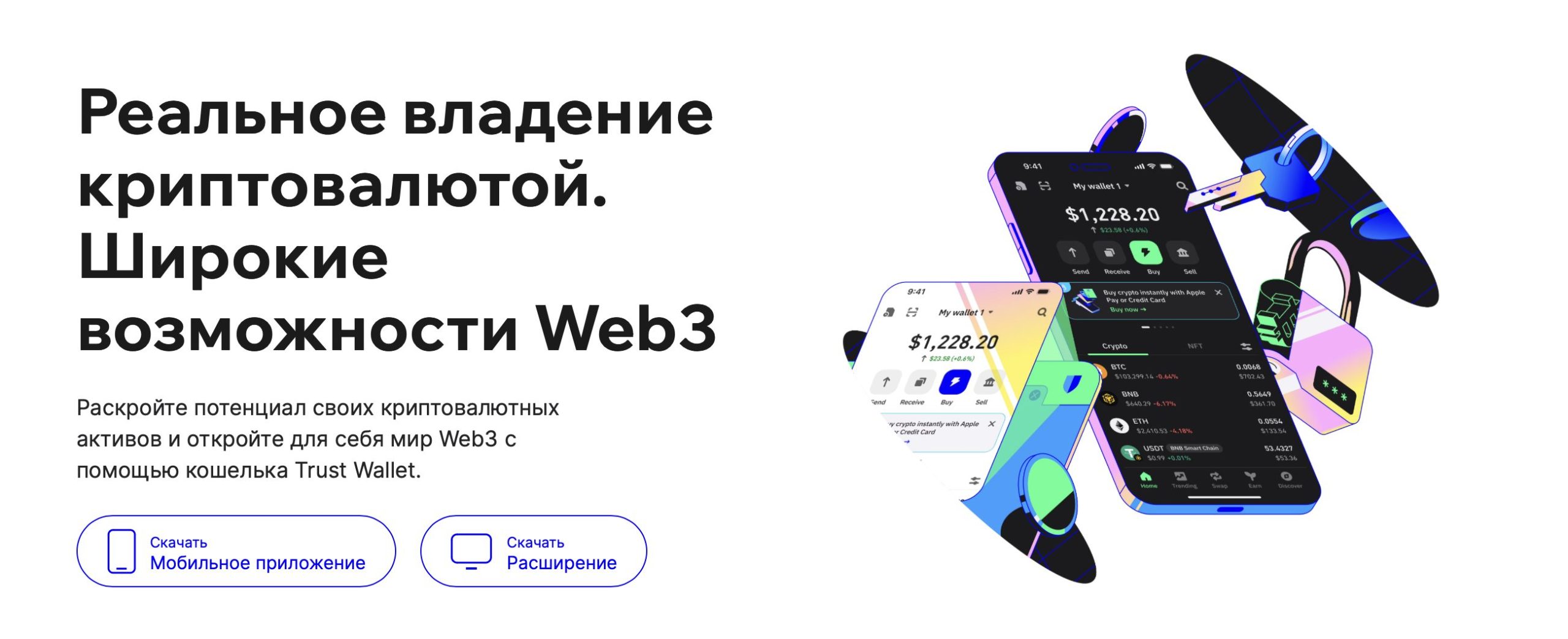 • Мобильное и расширение, dApp‑браузер, десятки сетей — Trust Wallet