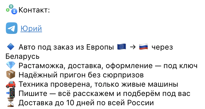 Наша редакция изучила проект автопригона — тг канал «Западный гараж», отзывы его подписчиков и рейтинги. Данное сообщество активно продвигает пригон авто из Европы под ключ. Обещают услуги полного цикла: якобы автомобиль подберут, проверят, растаможат и пригонят в сжатые срок через Беларусь. Гарантируют полное соответстветствие автомобилей представленным на фото, прозрачность и легальное оформление.