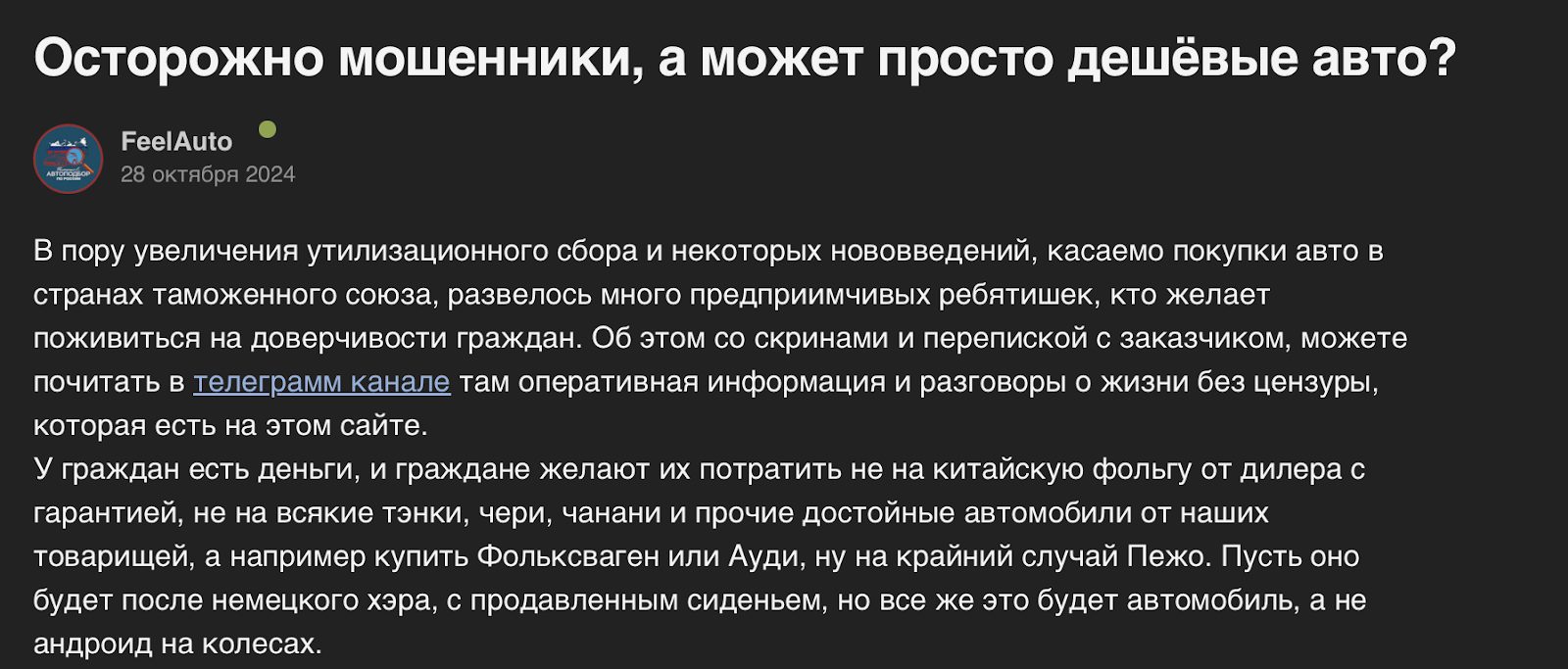 «Западный гараж» — телеграмм канал, повторяющий сотни таких же скам-проектов автопригона. Они стремительно плодятся в Telegram, но на фоне предстоящих ограничений постепенно переезжают во «Вконтакте». Просим оставаться бдительными и не доверять тем, кто предлагает иномарки заметно ниже рынка.