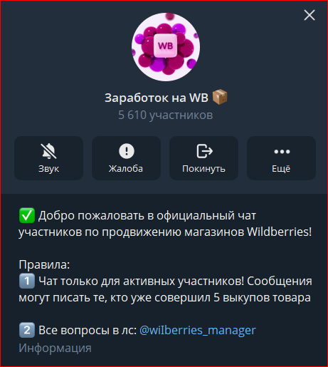 В сети ссылка на непосредственно телеграм-канал не сохранилась. Однако в ходе сбора информации мы нашли источник данных, с которого взяли все что нам надо. Итак, в описании сообщества эксперт заявлял про классификацию проекта как официального чата участников по продвижению магазинов. В качестве основной площадки деятельности выбран как раз Wildberries.