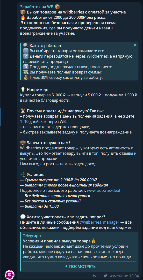 Работа с телеграм-каналом «Секреты от WB» принесет только убытки. Команда проекта продвигает скамовскую раскрутку счета: