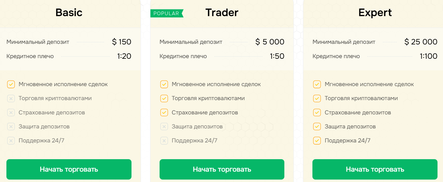 Для торговли через Zawayaly com понадобится минимум $150, за которые клиент может рассчитывать на мгновенное исполнение ордеров и минимальное плечо в 1:20. Больше опций можно получить за депозит от $5000.