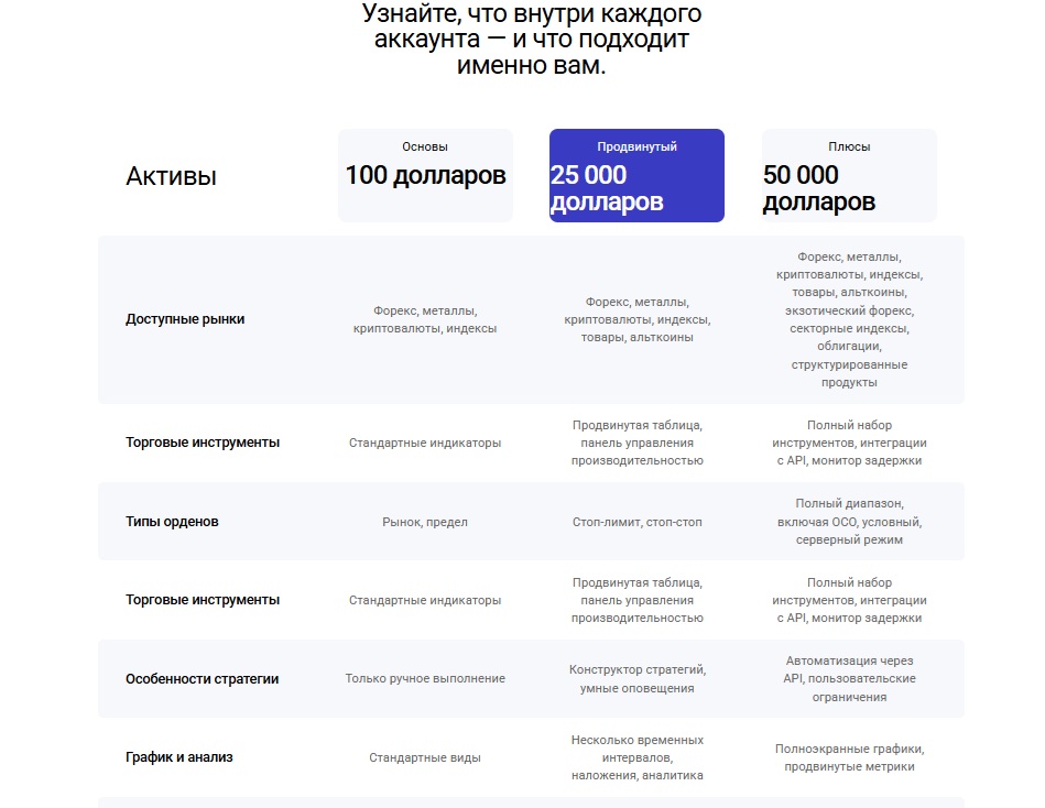 Торговые возможности зависят от суммы на счете. Начальный уровень от ста долларов открывает базовые индикаторы и ордера. Счет от 25 тысяч добавляет стоп-лимиты и конструктор стратегий. Максимальный уровень от 50 тысяч предлагает API и сложные типы заявок.