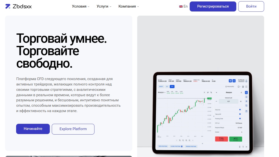 Основная ставка сделана на официальный сайт zbdsxx.com. Главная страница встречает минималистичным дизайном со слоганом Trade Smarter. Trade Freely. Текст позиционирует платформу как современный инструмент для активных трейдеров. Визуально сайт выглядит неплохо, но контент скорее имиджевый, чем информативный. Конкретных тарифов и деталей торговли на главной странице нет.