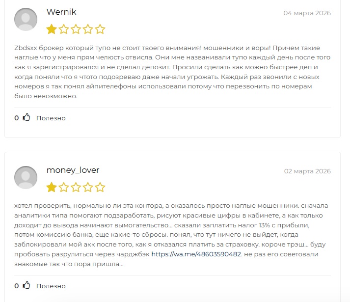 Гарантиям Zbdsxx доверять нельзя, и отзывы пострадавших это подтверждают. Людям показывали ложную прибыль, требовали комиссии за вывод и блокировали счета после отказов платить. Истории Алексея, Wernik и money_lover — звенья одной цепи. Все схемы брокера направлены только на выкачивание денег.