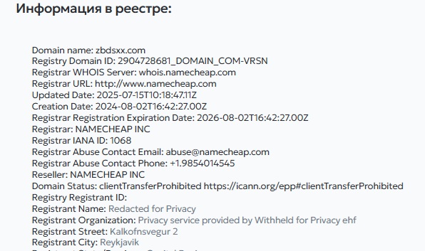 Проверка домена через WHOIS раскрывает реальный возраст проекта. Домен zbdsxx.com создан 2 августа 2024 года. Регистратор — компания NAME CHEAP INC. Данные владельца скрыты за приватным сервисом в Исландии.