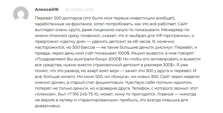 Пользователь Алексей16 потерял 800 долларов. Он перевел 500 долларов, после чего менеджер предложил VIP-программу с обещанием удвоить депозит. Когда на счету отобразилась прибыль, при попытке вывода потребовали внести страховочный депозит еще 300 долларов. После перевода денег счет заблокировали, а сайт сменил домен.