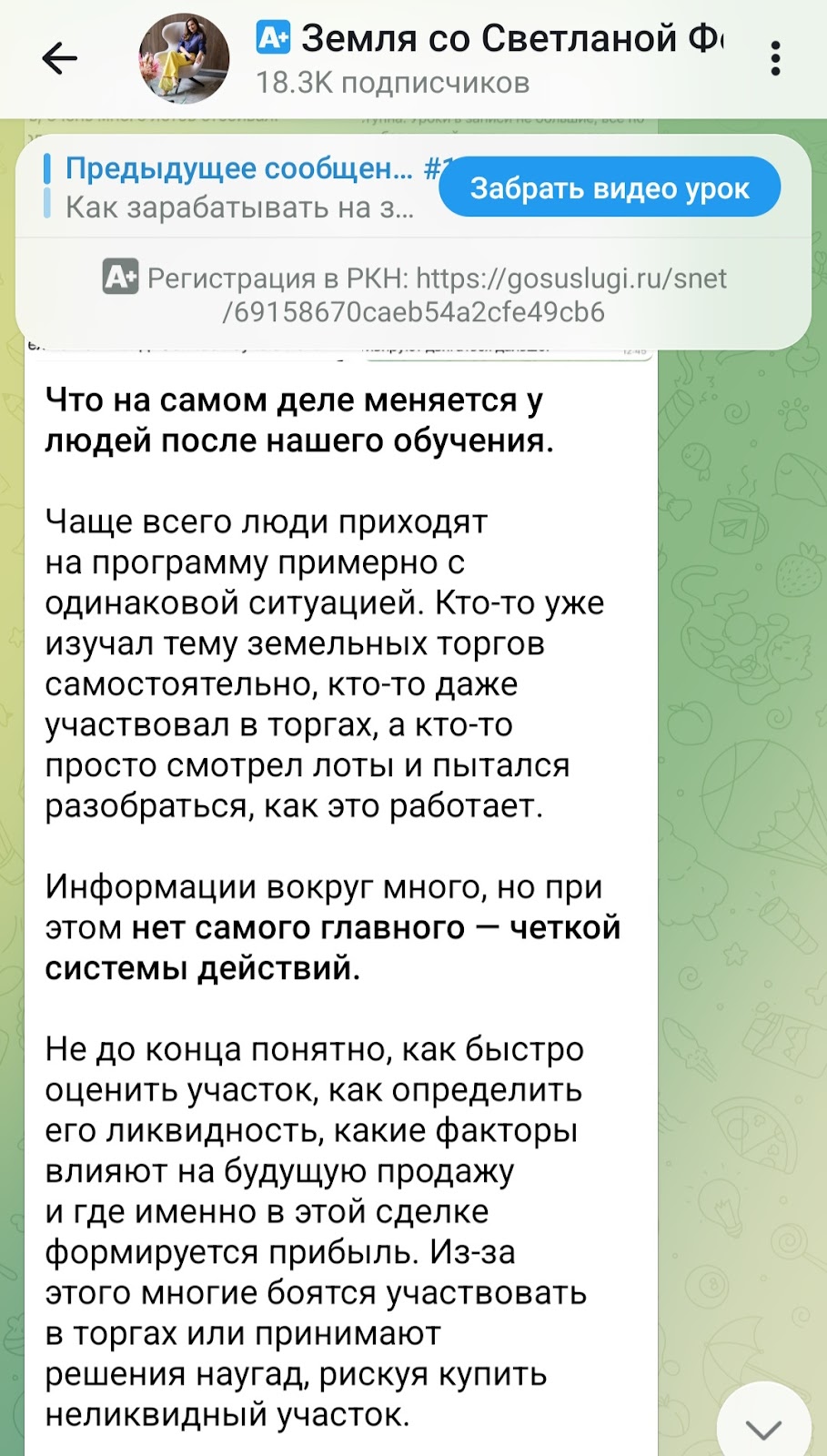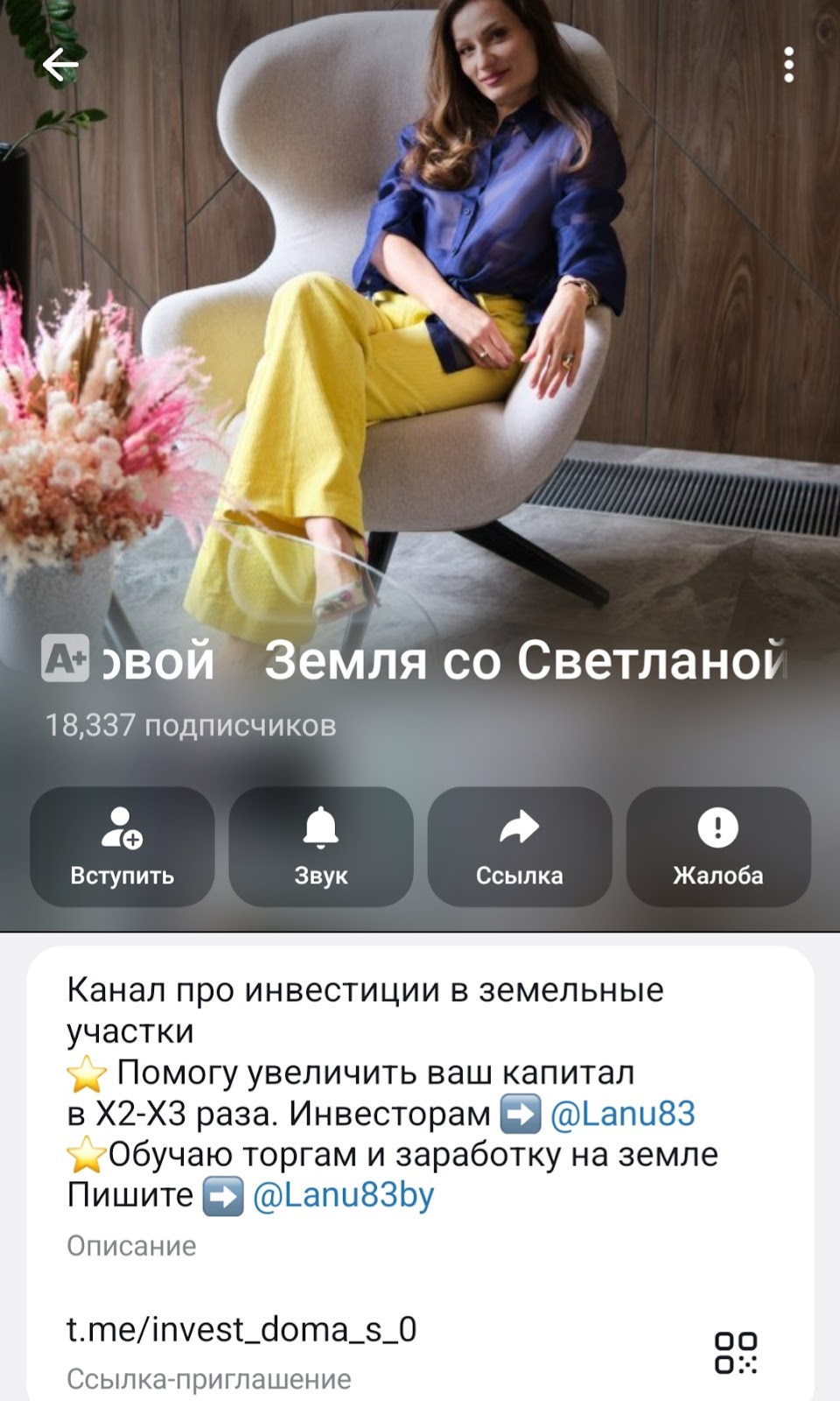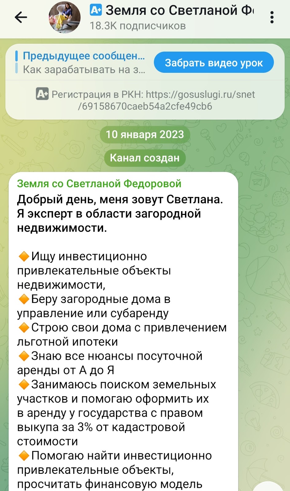 Федорова ведет канал в ТГ “Земля со Светланой Федоровой”. Представляет его как сообщество про инвестиции в земельные участки.