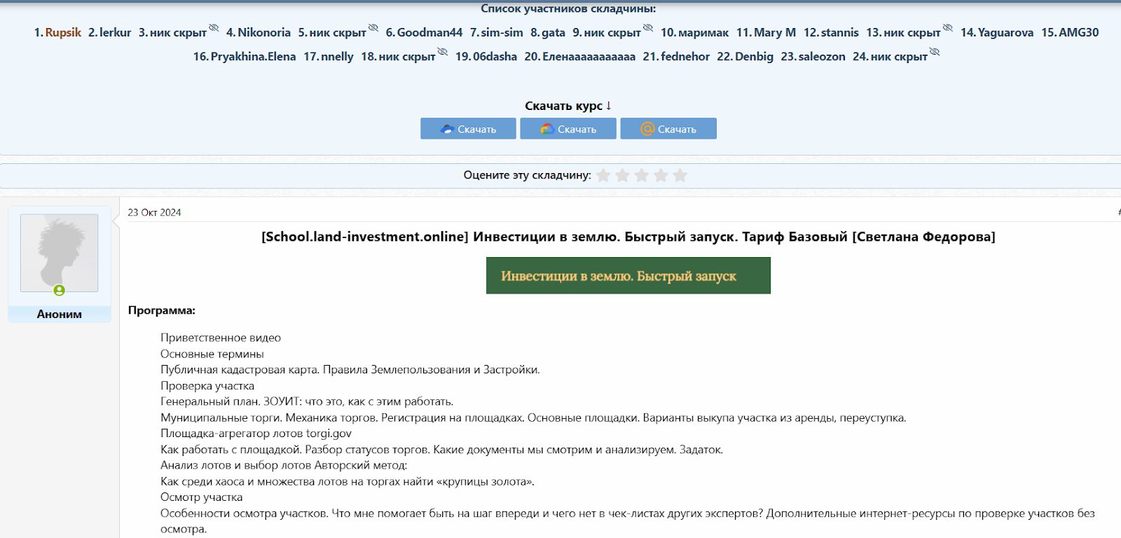 Также предложение о покупке курса “Инвестиции в землю быстрый запуск” размещено на сайте s4 skladchinabiz pro. Тут приводится список тем, которые будут рассмотрены в ходе обучения. Федорова обещает:
