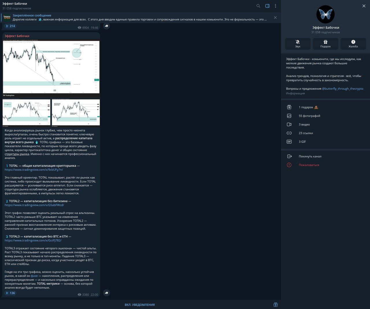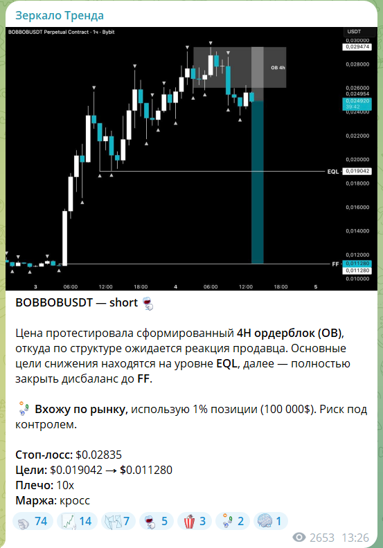 Высока вероятность того, что автор использует активную накрутку аудитории, чтобы «прогреть канал». Он демонстрирует свой анализ, предлагает сигналы для входа в сделку и закрытия: