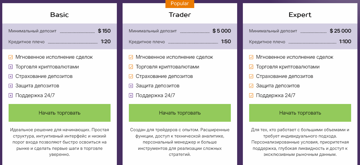 Разработчики финансовой платформы предлагают гражданам пройти быструю регистрацию и пополнить депозит. Владельцам типа аккаунта «Эксперт» предоставляются услуги техподдержки круглосуточно. Юзерам, подключившим базовый трейдинг пакет, можно рассчитывать только на мгновенное совершение торговых операций.