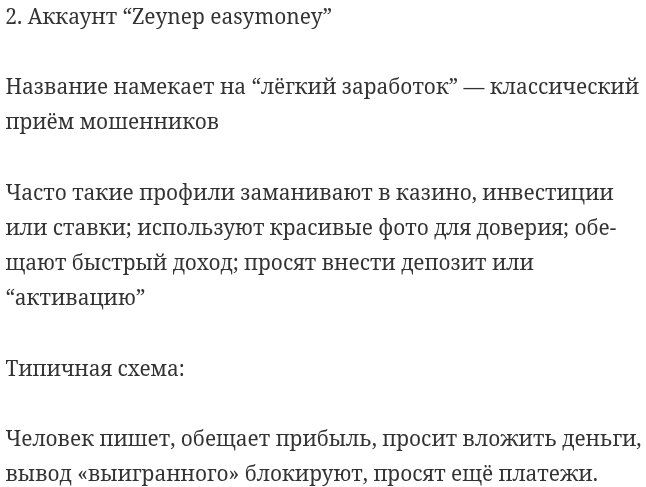 Zeynep EasyMoney — типичный представитель партнеров скам-казино. Автор использует давно известную систему с раскруткой счета, когда обещает легкий и быстрый заработок. Хотя реальность крайне удручающая для доверчивых пользователей. Касательно Zeynep EasyMoney, то важно еще учесть следующие факты: