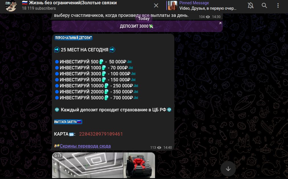 Деньги необходимо переводить на карту — 2204320979109461. Однако, реальную схему автор ТГ-канала «Жизнь Без Ограничений Золотые Связки» скрывает. Сразу после менеджер проекта пишет, что надо подождать пару часов, пока работа будет завершена. Далее представитель сообщества утверждает про необходимость оплаты комиссии за перевод. Если подписчик платит, то он попадает в круг до полного обнуления баланса банковского счета, а потом в блок.