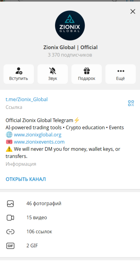 Биржа имеет аккаунты в нескольких социальных сетях. Сообщество Zionix Global Official создано в апреле 2025 года. Такое отличие между возрастом сайта и аккаунта объясняется очень просто: брокер неоднократно менял доменные имена в связи с их блокировкой. На канал подписано 2875 человек. Комментарии закрыты, но просмотры составляют около 45%. Посты выходят достаточно часто. Они посвящены новостям биржи и рекламе различных проектов. Часто выкладываются анонсы и расписание будущих вебинаров. Последние тематические, содержат обучающие материалы по криптовалюте, торговле и рынкам в целом. Состоит из двух сессий. В первой могут принять участие клиенты со стандартными базовыми тарифными планами. Для владельцев элитных тарифов предусмотрены индивидуальные занятия.