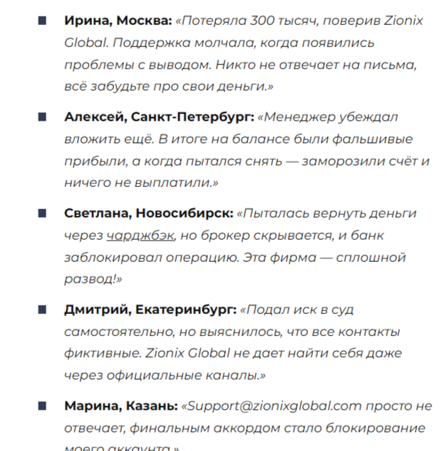 Отзыв о деятельности брокера немного и все отрицательные. На тематических площадках и форумах пользователи пытаются объяснять, что «Зионикс Глобал» это типичный скам.