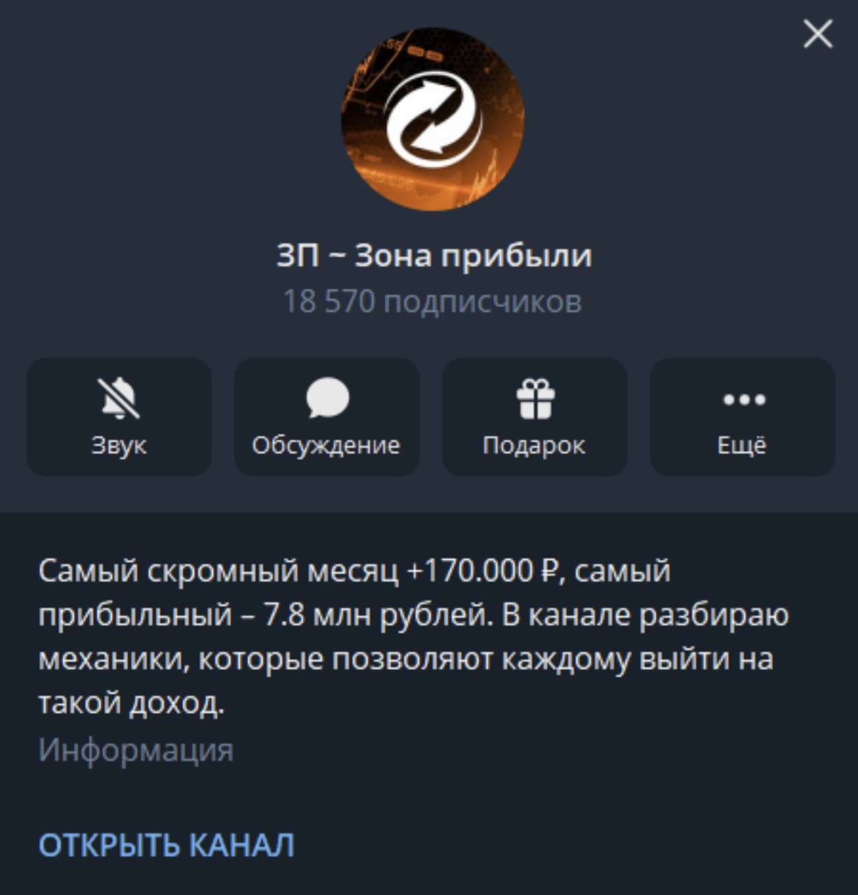 Телеграмм канал ЗП Зона Прибыли предлагает зарабатывать минимум ₽170000 в месяц. Идея интересна более 18500 подписчиков. Однако существенная их часть может оказаться ботами, на что намекает количество просмотров публикаций.