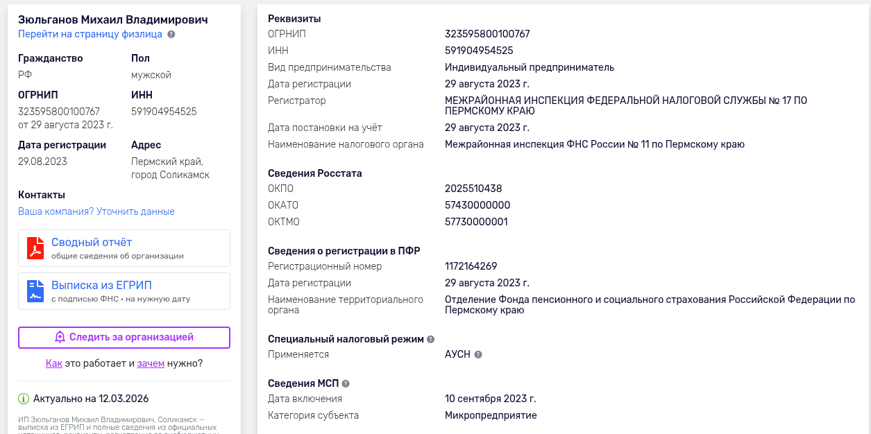 ИП зарегистрировано 29 августа 2023 года, основной вид деятельности — дополнительное образование детей и взрослых. Лицензии на образовательную деятельность у ИП Зюльганова нет, что подтверждают открытые реестры.